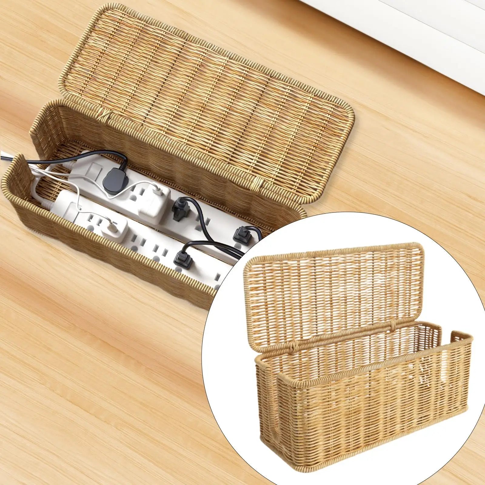 Crafted from eco-friendly wood materials with hand-woven rattan detailing, this box combines rustic charm with modern functionality, making it suitable for home offices, living rooms, or any space requiring cable organization. The simple setup requires no assembly, providing an immediate solution for managing computer wires, TV cables, USB hubs, and power strips while enhancing your interior décor.